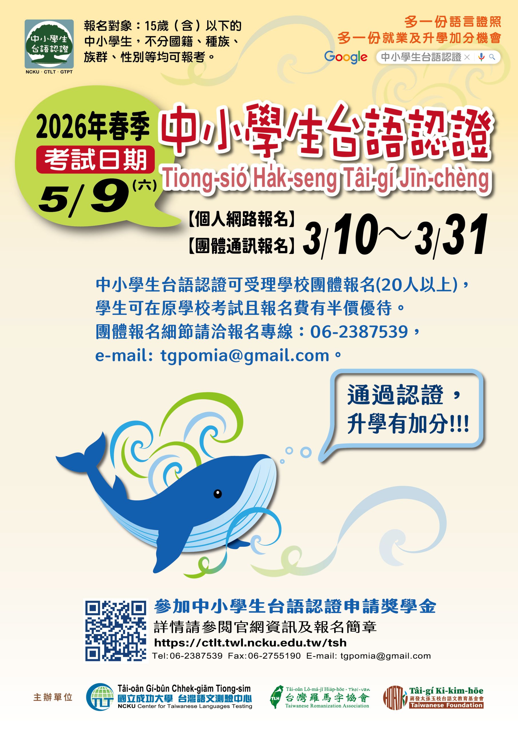 團體報名(20人)請聯絡成大台灣語文測驗中心:06-2387539, 或EMAIL:tgpomia@gmail.com